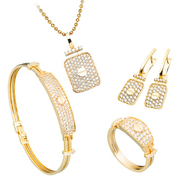 Bộ trang sức màu vàng, chất liệu vàng 18k gắn đá CZ trắng.