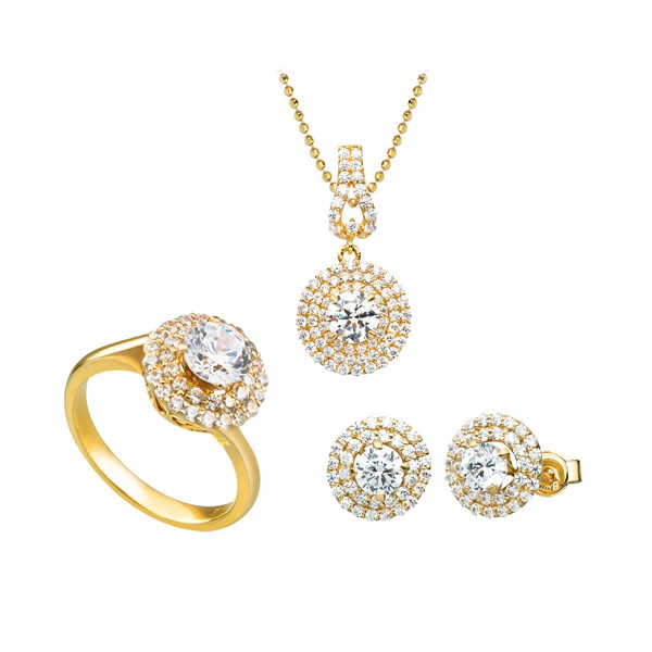 Bộ trang sức màu vàng chất liệu vàng 18k gắn đá CZ trắng.